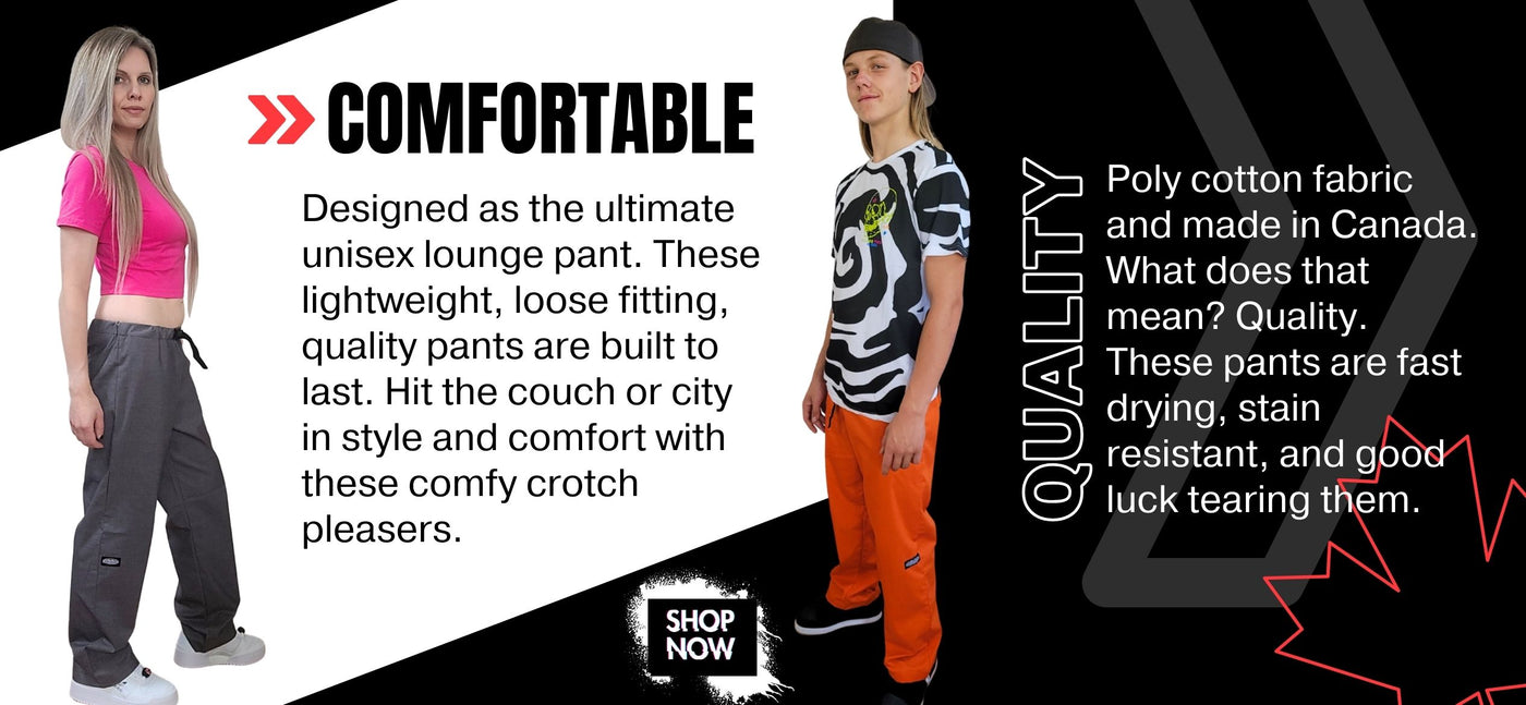 YES. Our fabric comes from Canadian suppliers. Our pants are manufactured in Canada. Orders ship out of Canada. Owners are Canadian. Customer service? You’ll talk to a Canadian. Technical issues? We’ll call a Canadian. What can we say? We LOVE Canadian’s. Well, most of them.